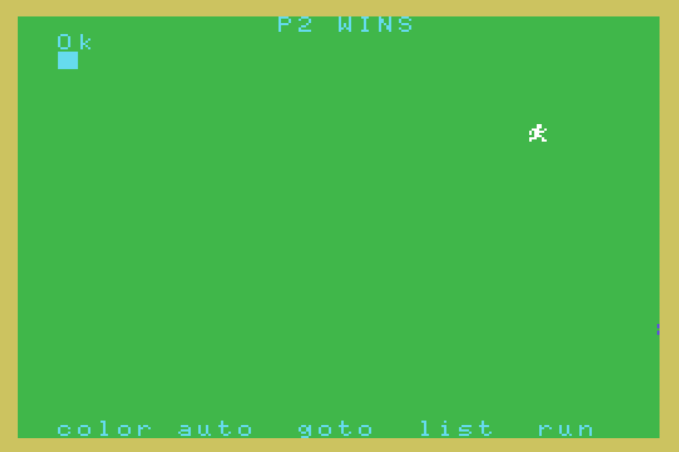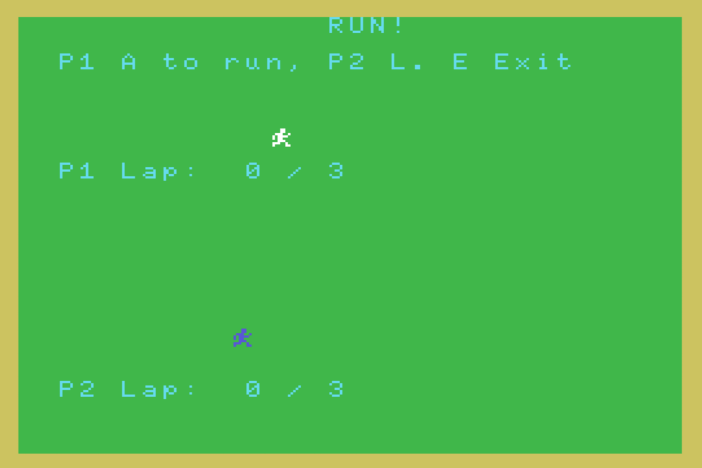 10 SCREEN 1,0:COLOR 7,2,10:LOCATE 13,0:PRINT"RUN!":P1$="":P2$="":P1X=0:P2X=0