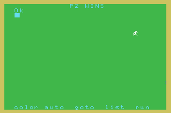 IF P1X\255 <> LAPS AND P2X\255 <> LAPS THEN GOTO 40 ELSE KEYON Here we check if either P1 or P2 have completed the whole game laps, if not, the computer goes back to the next input reading loop in line 40, otherwise the game is ended because there are no more instructions after this line. However, before ending, the keys at the bottom of the screen (color, auto, etc.) are displayed again for the user with the command KEYON. Sprites wil be still visible on the screen, again, due to the restrictions of the contest.